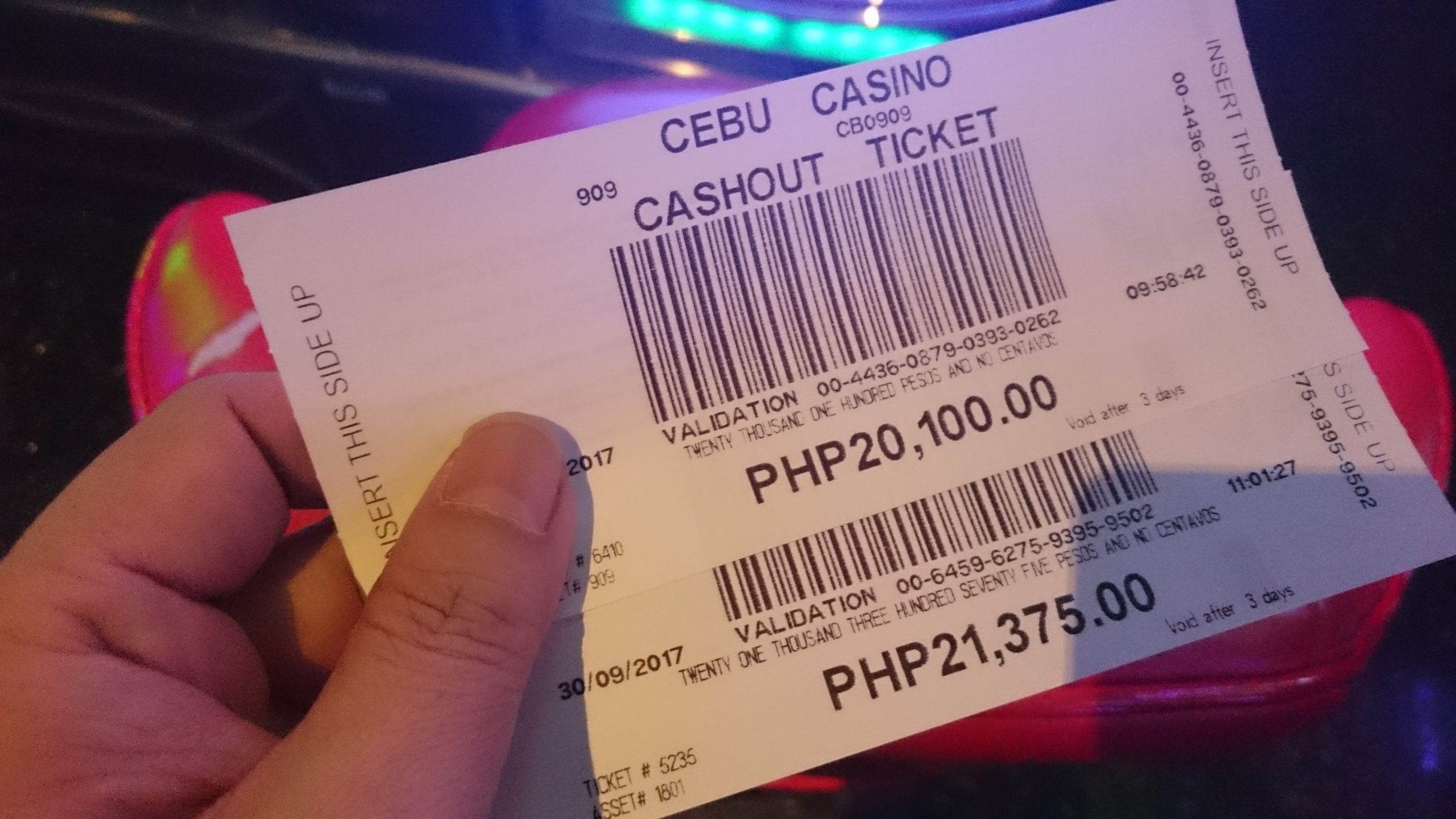 フィリピンペソで表記されてます。この用紙を窓口持っていくと換金してくれます。1ペソ2円位の感覚です。この時は結果ですけど、10万使って20万戻し、結果10万勝ちみたいな終わり方です。